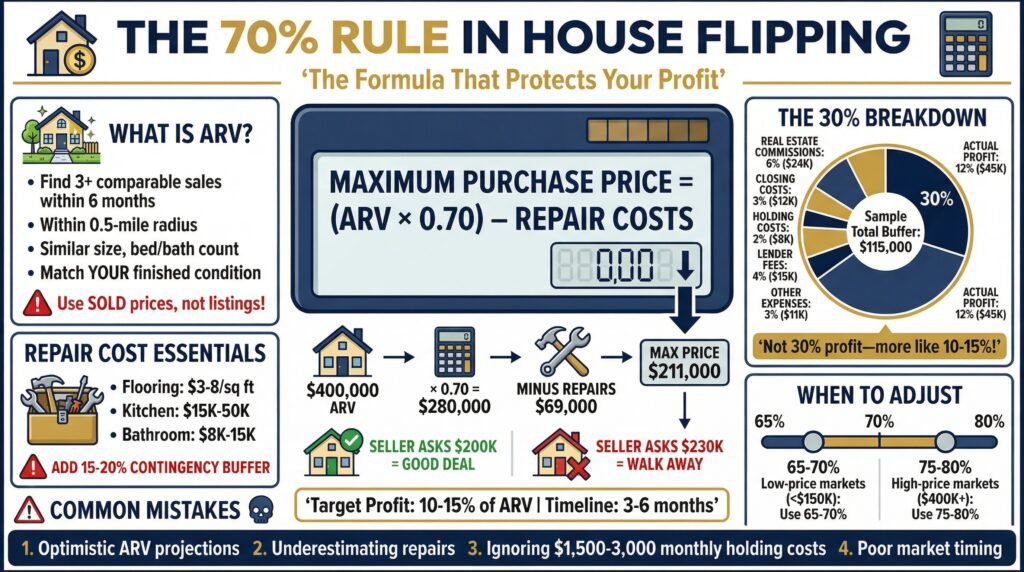 The 70% rule states that you shouldn’t pay more than 70% of the property’s after-repair value minus repair costs. This formula emerged from decades of real-world flipping experience, accounting for all the expenses that beginners consistently underestimate or forget entirely.